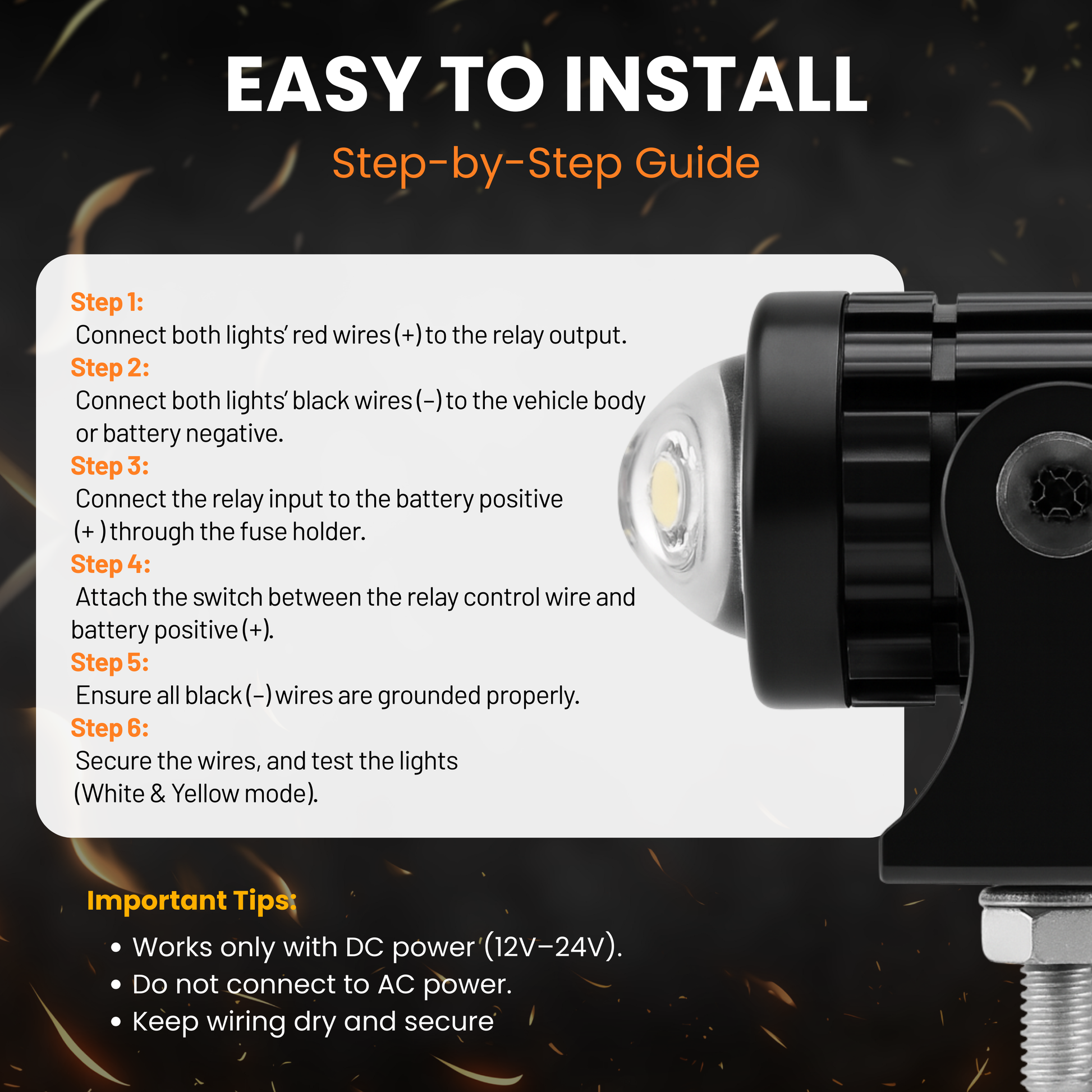 Featuring yellow and white light modes, the fog light adapts to varying environments—yellow light improves visibility in fog, rain, and snow by reducing glare, while white light provides bright, clear illumination for everyday city and highway driving. Powered by high-efficiency LED technology, it delivers up to 3500 lumens per light with uniform beam distribution and low power consumption, ensuring reliable performance without taxing the vehicle’s electrical system.