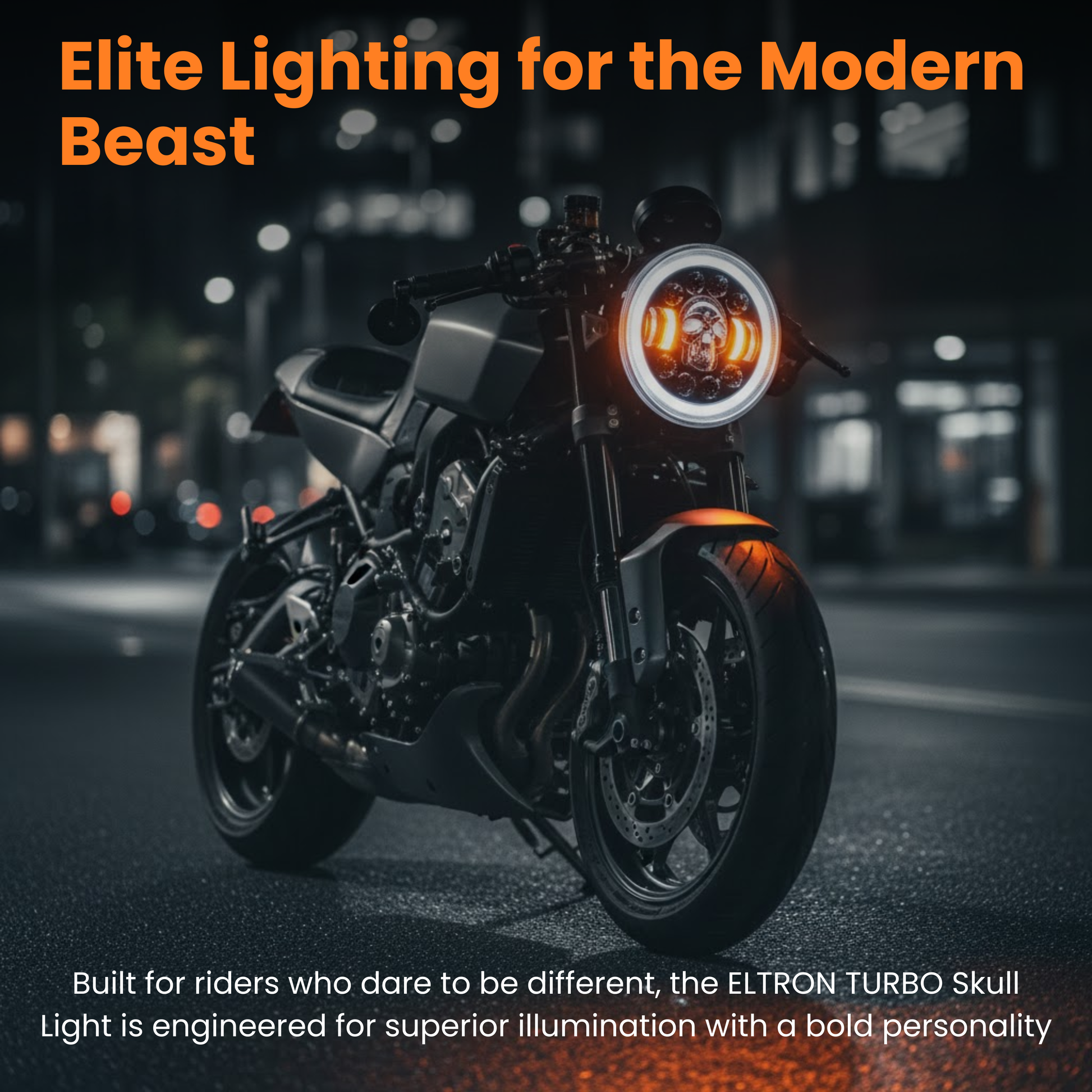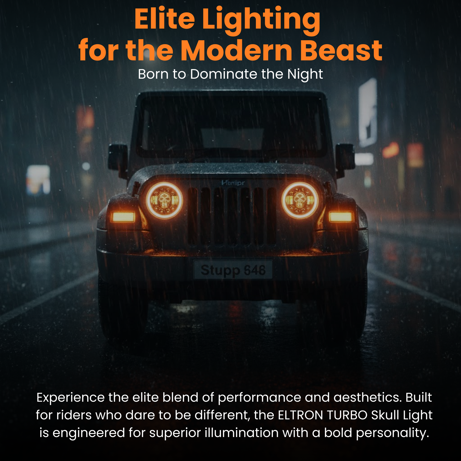 The Eltron Turbo Skull Design LED DRL Headlight combines advanced LED technology with a bold skull-inspired design to deliver enhanced visibility and a distinctive visual upgrade for your vehicle. Featuring dual-color DRL functionality, it offers yellow light for improved visibility in foggy or misty conditions and white light for clear illumination during normal driving.